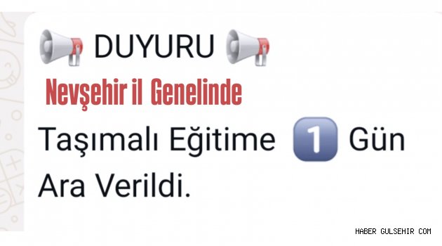 Nevşehir Valiliğinden yapılan açıklamaya göre; İlimiz genelinde olumsuz hava koşulları nedeniyle ulaşımda oluşabilecek risk ve tehlikelere karşı tedbir amacıyla, köylerimizden ve beldelerimizden taşımalı eğitim yolu ile okullarımıza erişimi sağlanan temel eğitim, ortaöğretim ve özel eğitim öğrencileri için eğitim-öğretime 5 Şubat 2025 Çarşamba günü bir (1) gün süreyle ara verilmiştir.