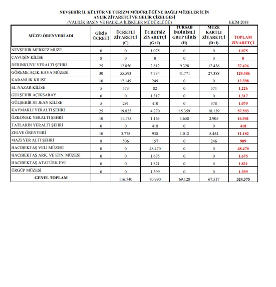 NEVŞEHİR İL KÜLTÜR VE TURİZM MÜDÜRLÜĞÜNE BAĞLI MÜZELER İÇİN AYLIK ZİYARETÇİ VE GELİR ÇİZELGESİ (VALİLİK BASIN VE HALKLA İLİŞKİLER MÜDÜRLÜĞÜ)