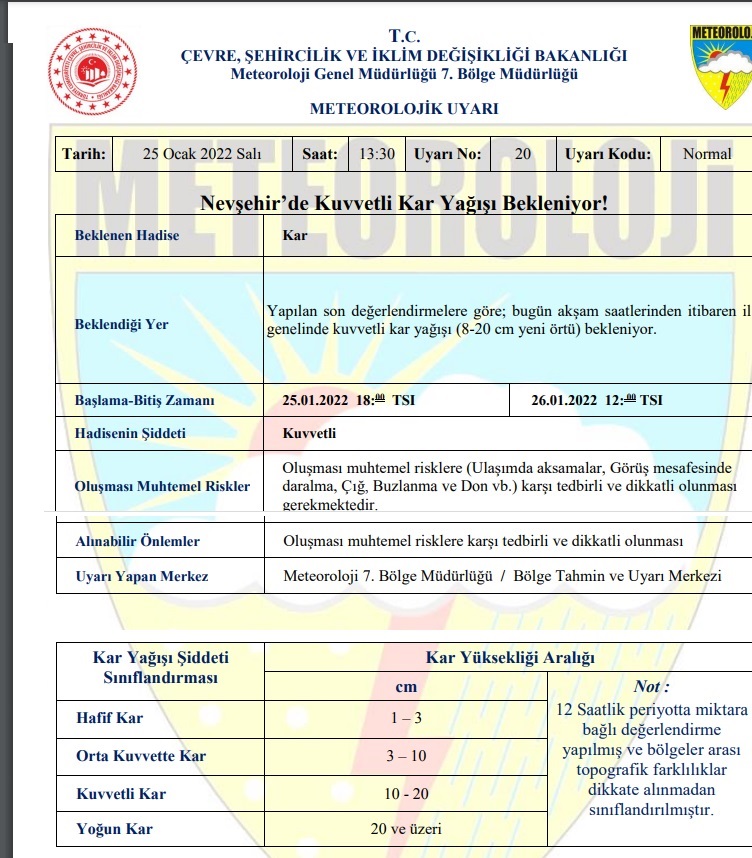 Nevşehir Valiliği, Yapılan son değerlendirmelere göre; bugün akşam saatlerinden itibaren il genelinde kuvvetli kar yağışı (8-20 cm yeni örtü) olacağı uyarısında bulundu.