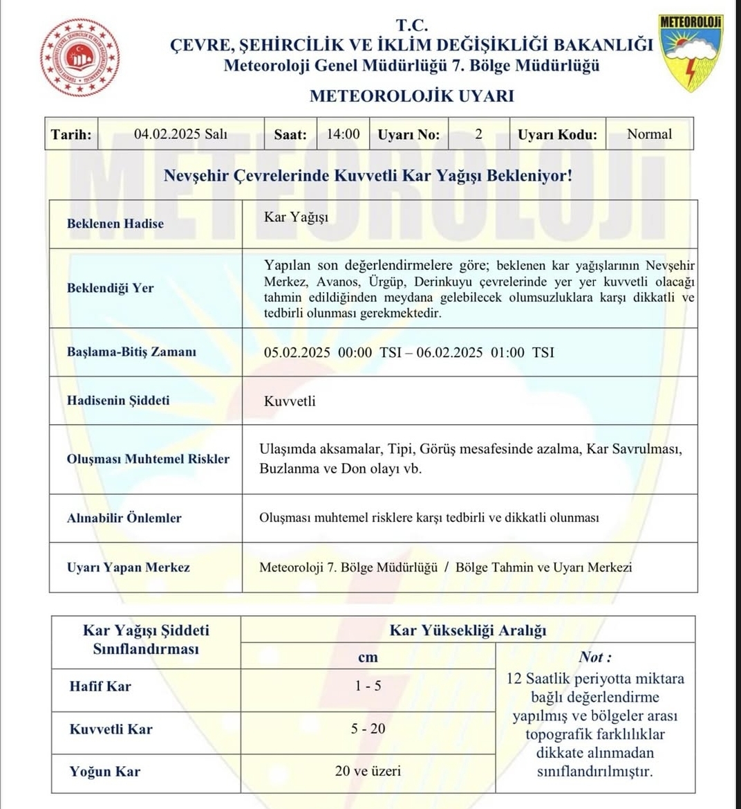 Yapılan açıklamada; Yapılan son değerlendirmelere göre; beklenen kar yağışlarının Nevşehir merkez, Avanos, Ürgüp, Derinkuyu çevrelerinde yer yer kuvvetli olacağı tahmin edildiğinden meydana gelecek olumsuzluklara karşı dikkatli ve tedbirli olunması gerekmektedir" denildi.