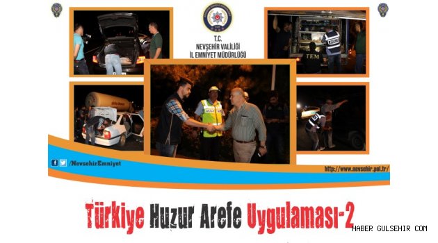Nevşehir Emniyet Müdürlüğü Ekipleri tüm Türkiye’de eşzamanlı olarak 29,08,2017 tarihinde 14.00-19.00 ve 20.00-23.00 saatleri arasında Emniyet Müdürü Mehmet ARTUNAY’ın denetiminde İlimiz Merkez ve İlçelerinde 38 ekip 139 personelin katılımı ile “Türkiye Huzur Arefe Uygulaması-2” uygulaması yaptı,