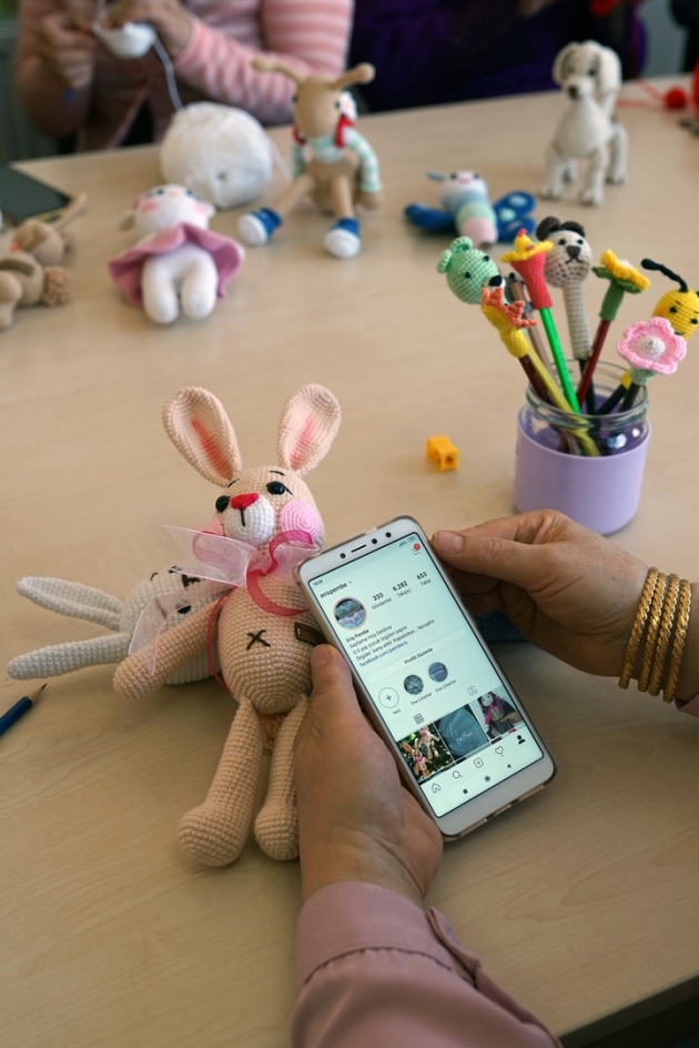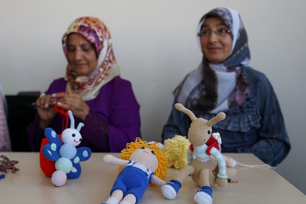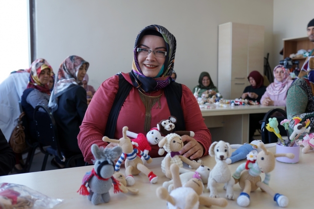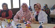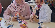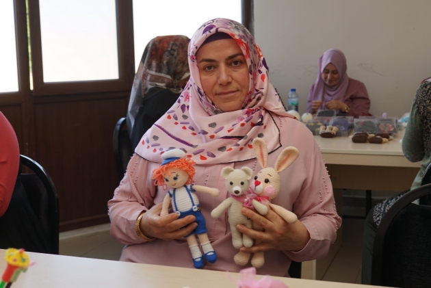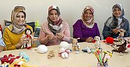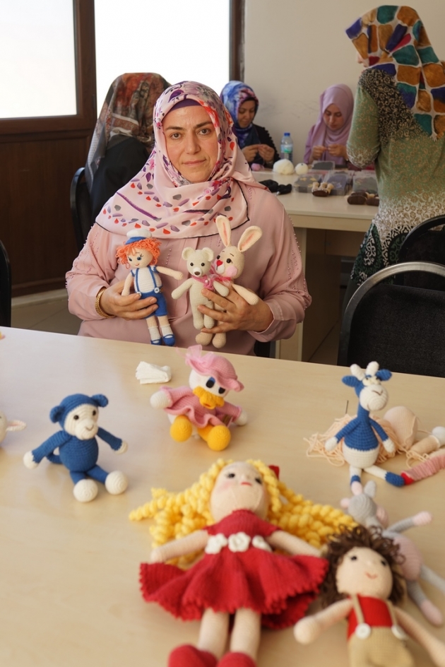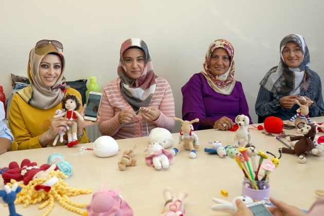 Kurs Öğretmeni Elmas Kocatepe nezaretinde örgü hayvan figürleri, bebekler, çizgi film karakterleri, kalemlik, peribacaları ve balonlar ile iğne oyası ile fular, kolye ve küpe yapan kadınlar, yaptıkları ürünleri internette kurdukları sanal mağazalarında satarak ev