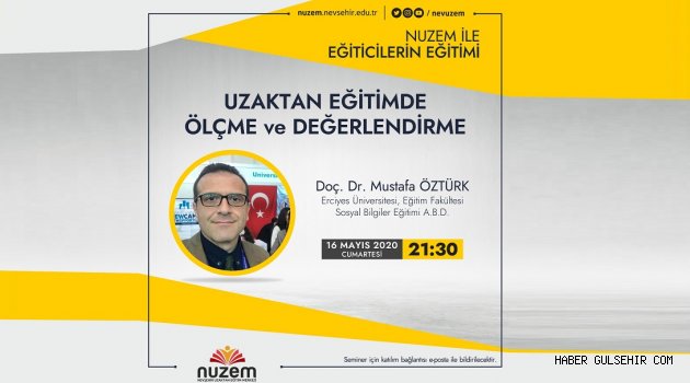 NUZEM eğiticilerin eğitimi seminerlerinin ilki 16 Mayıs Cumartesi günü saat 21:30’da Erciyes Üniversitesi (ERÜ) Öğretim Üyesi Doç. Dr. Mustafa Öztürk tarafından “Uzaktan Eğitimde Ölçme ve Değerlendirme” konusunda verilecek.
