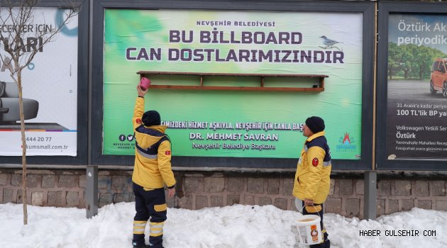 Belediye tarafından kentin çeşitli noktalarında bulunan ve üzerinde ‘Bu Billboard Can Dostlarımızındır’ yazan billboardlara ahşap kuş yemlikleri monte edildi.