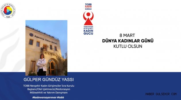 TOBB Nevşehir Kadın Girişimciler Kurulu Başkanı Gülper Gündüz Yassı, 8 Mart Dünya Kadınlar Günü dolayısıyla bir açıklamada bulundu. Gülper Gündüz Yassı açıklamasında;