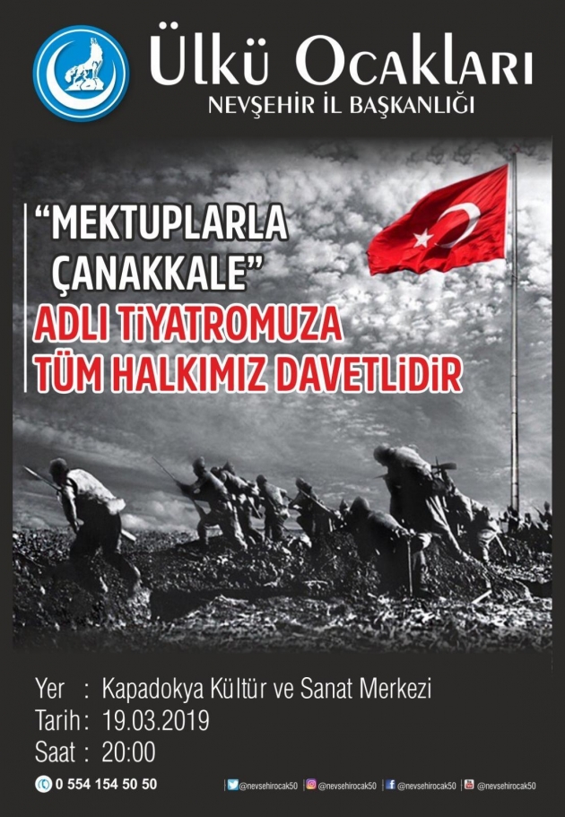Çanakkale Zaferinin 104.yılı münasebeti ile Ülkü Ocakları Nevşehir İl Başkanlığı bugün akşam “Mektuplarla Çanakkale” adlı tiyatro gösterisi düzenleyecek.