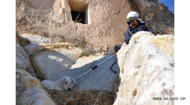 Dik kayaların arasında 2 gündür bir köpeğin havladığını duyanlar, itfaiye ekiplerinden yardım istedi. Olay yerine giden ekipler, kayalıkların arasında açlık ve susuzluktan bitâp düşmüş haldeki köpeği gördü. Arazinin dik oluşu nedeniyle güvenlik önemleri alan Ürgüp Belediyesi ekipleri, köpeği mahsur kaldığı 150 metre yüksekliğindeki kaygan kayalıklardan kement ve halat yardımıyla kurtardı.